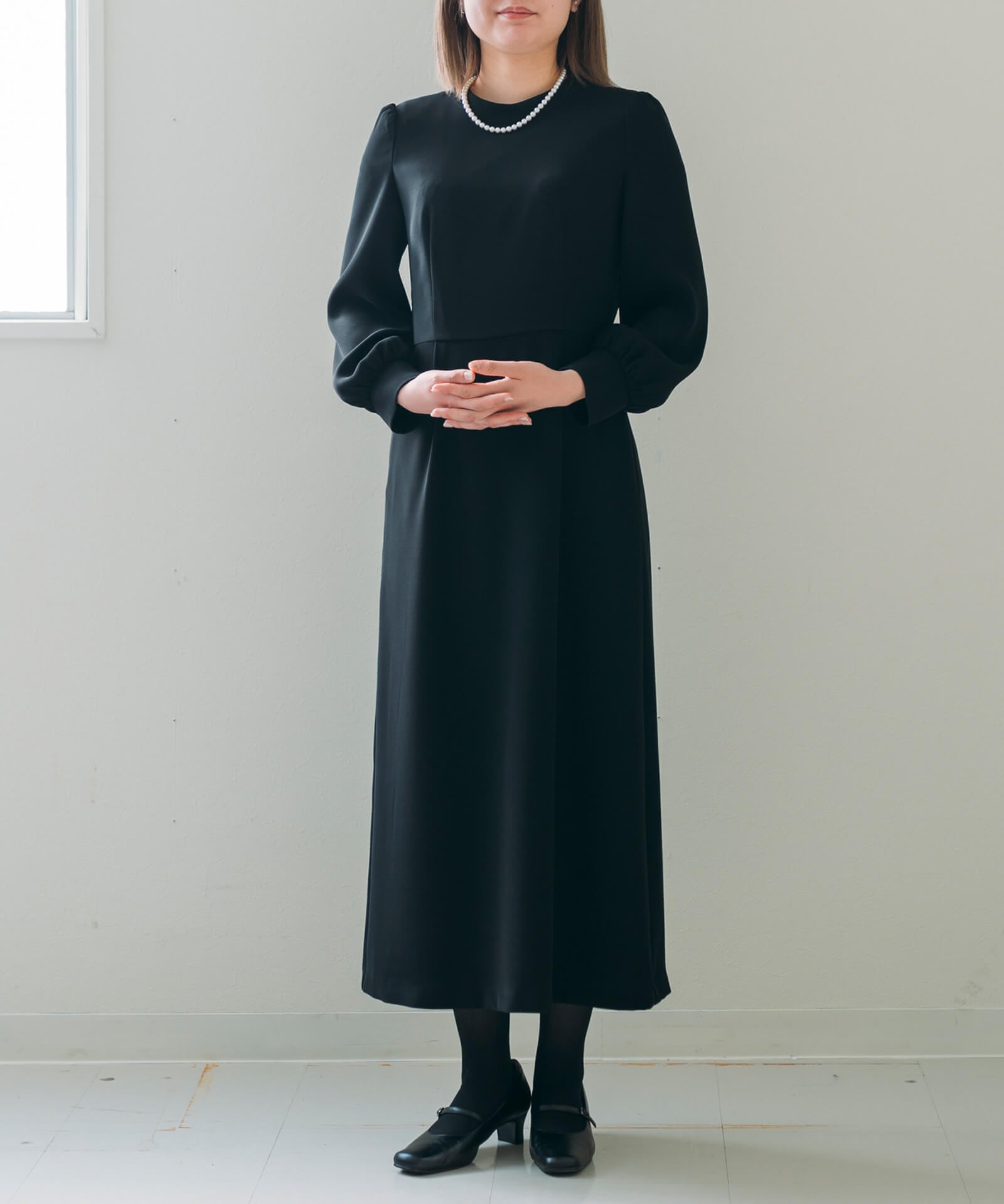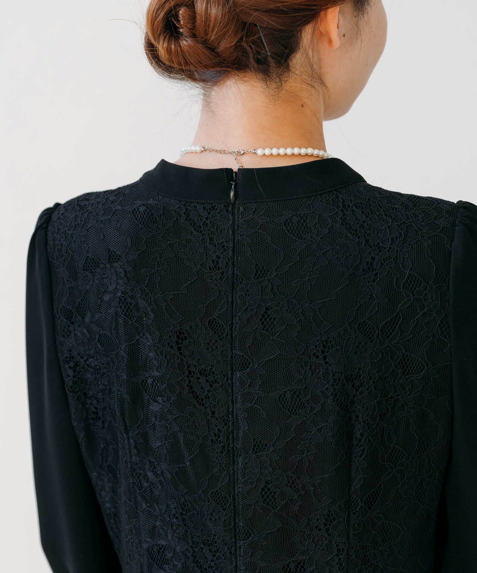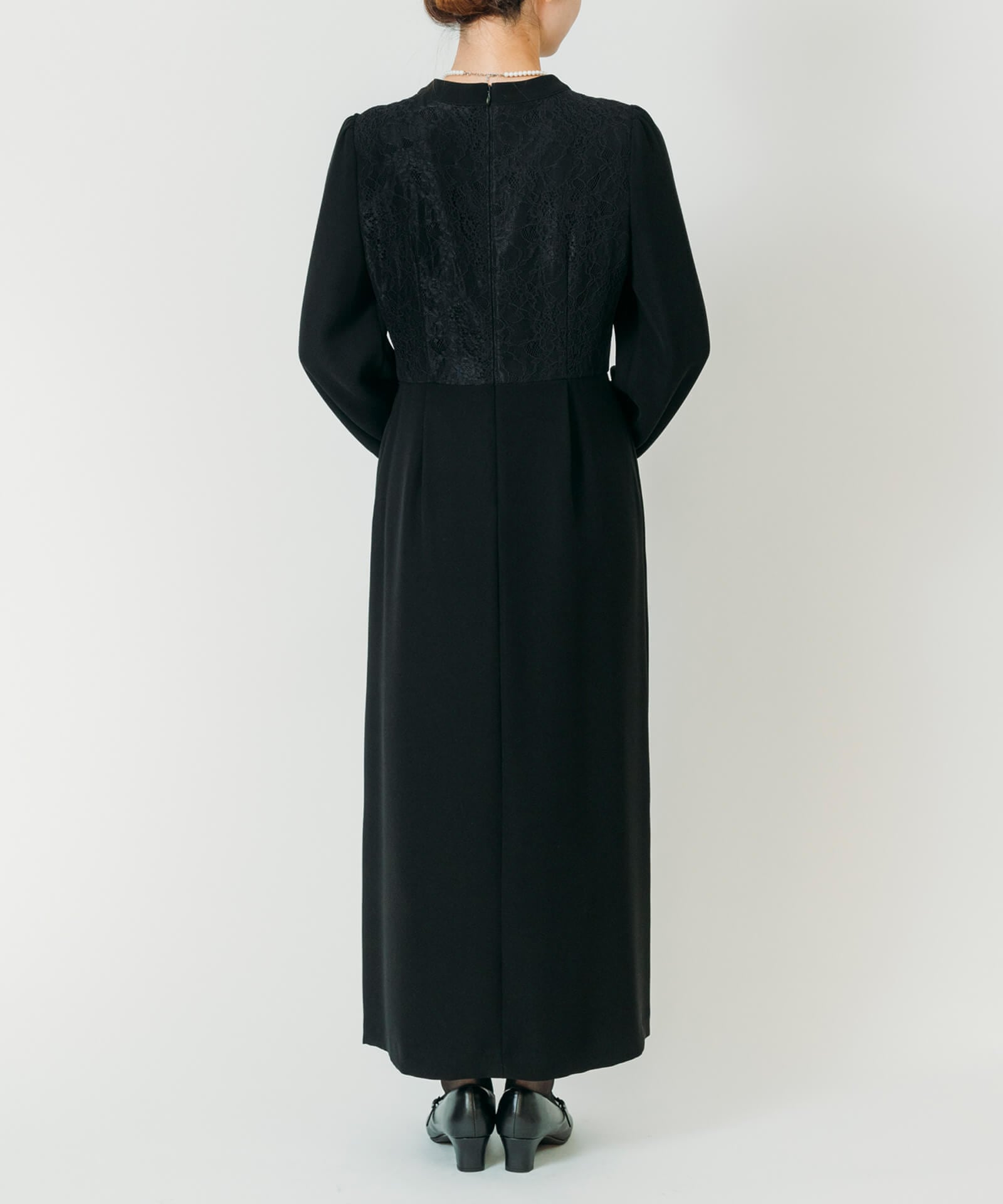背中の大人な花模様のレースと、肩と袖に施されたやや立ち上がったパフが女子力を上げてくれるデザイン。ハイウエストの切り替えと丈を長くすることで脚が長く見え、ウエスト周りのフロント・バックに2本ずつ設けられたタックはスタイルよく見せてくれます。